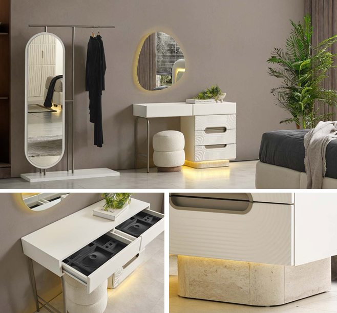 YATAK ODA TAKIMIMIZ: DOLAP .AYNALIŞİFONYER .BOY AYNASI PUF.2 ADET KOMİDİN BAŞLIK.