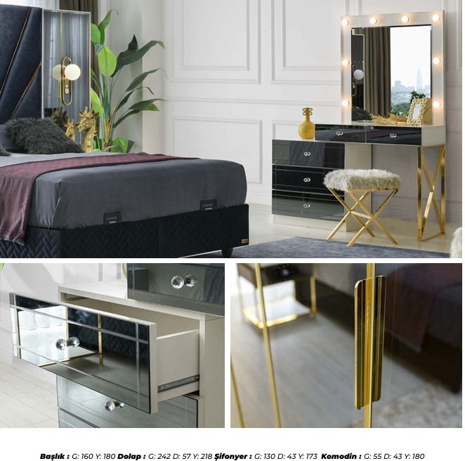 YATAK ODA TAKIMIMIZ 1 ADET DOLAP .2 ADET KOMİDİN.1 ADET BAŞLIK .1 ADET PUF .AYNALI ŞİFFONYERDEN OLUŞMAKTADIR.