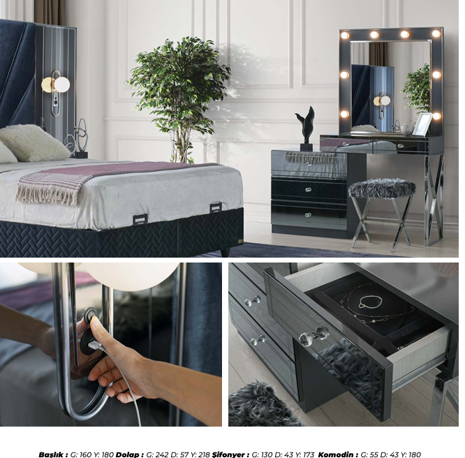 YATAK ODA TAKIMIMIZ 1 ADET DOLAP .2 ADET KOMİDİN.1 ADET BAŞLIK .1 ADET PUF .AYNALI ŞİFFONYERDEN OLUŞMAKTADIR.
